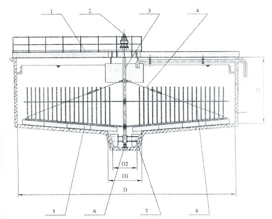 本機主要由工作橋、中心驅動裝置、傳動軸、刮臂、刮泥板、水下軸承等組成,該設備工作時,污水由濃縮池上部的配水管進入到穩流筒中,由穩流筒緩慢擴散到濃縮池四周。污泥在重力作用下逐漸沉降到池底,由刮板將污泥刮集到池底中心的集泥池,由泵或自壓排出池外,以達到污泥濃縮的目的。